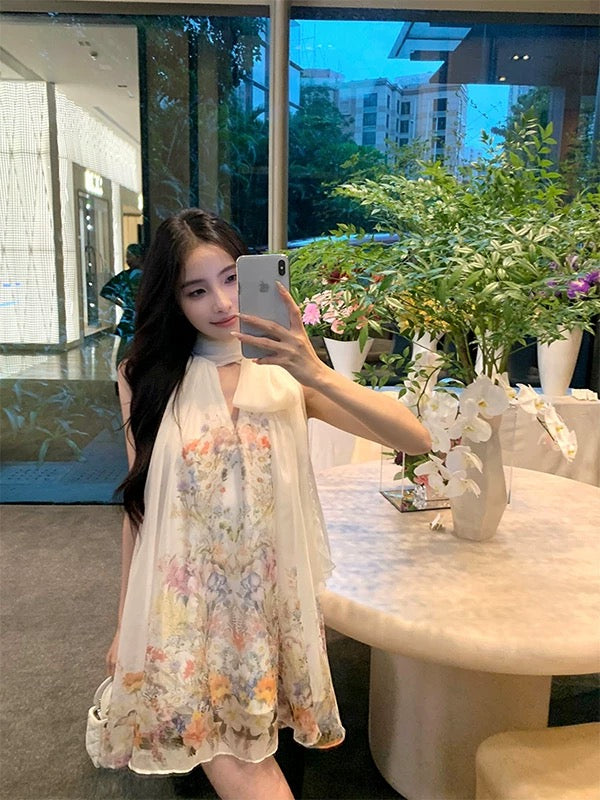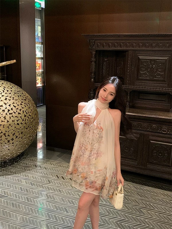 云烟剪影 印花网纱挂脖连衣裙 Misty Silhouette Printed Mesh Halter Neck Dress