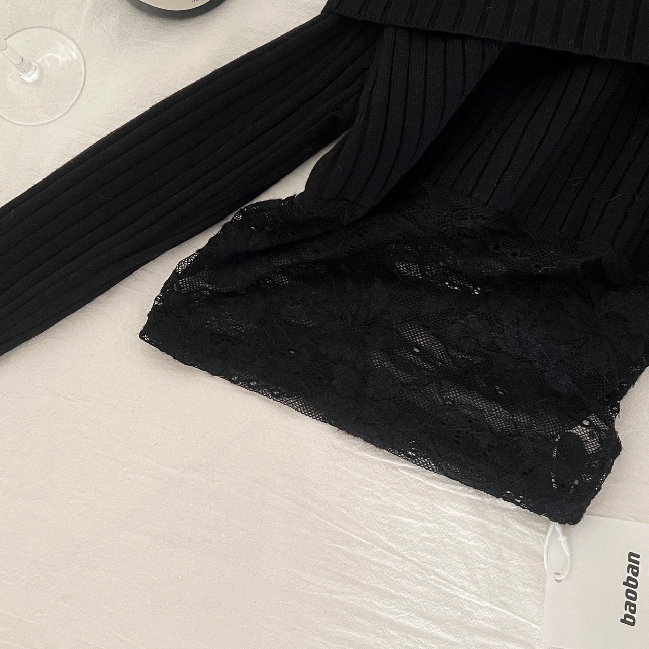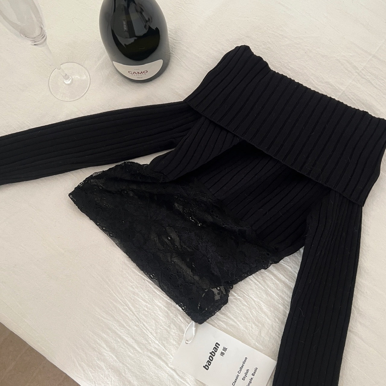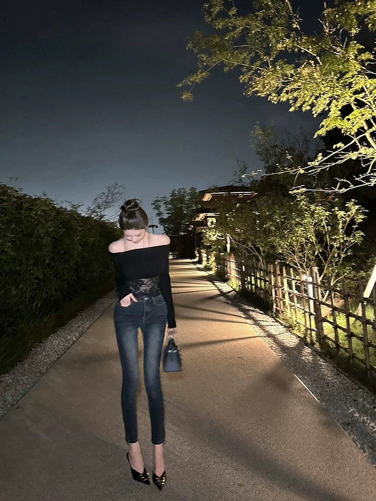 半雾弥香 蕾丝拼接性感一字肩针织衫上衣 Hazy Charm Lace-Panel Off-Shoulder Knit Top
