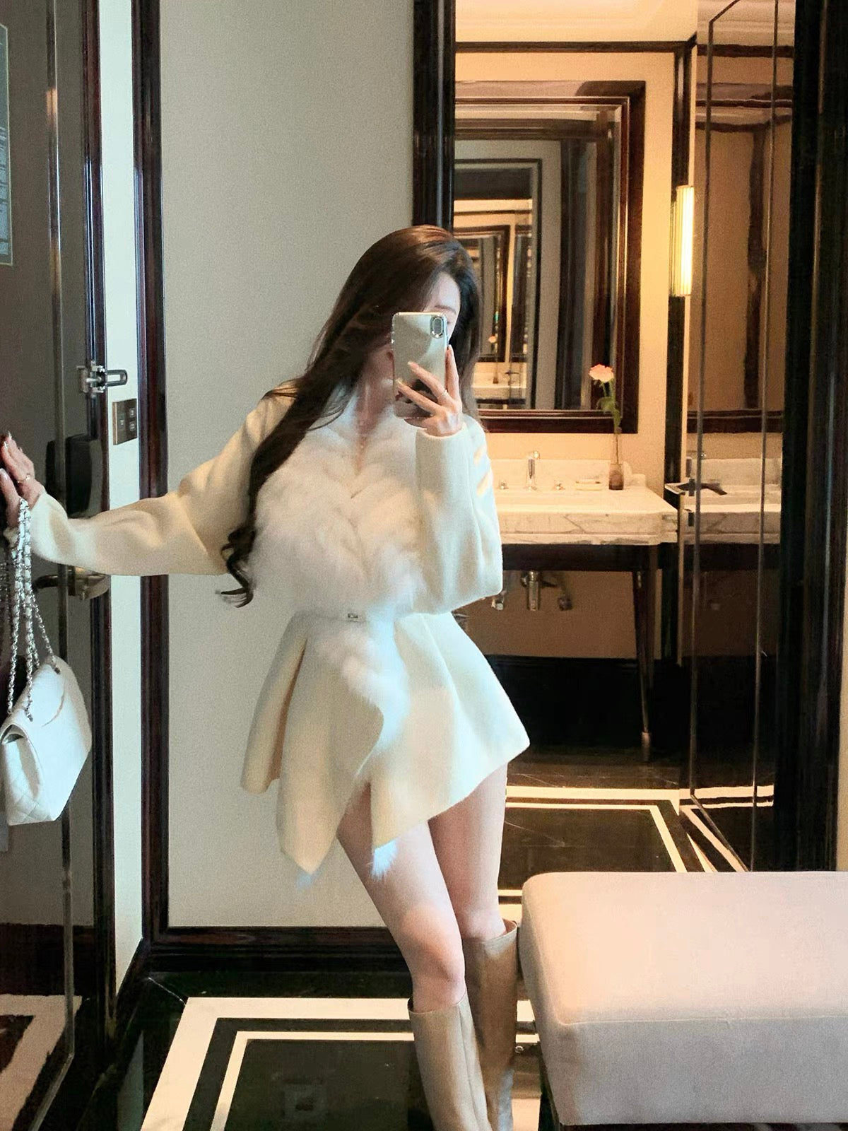 娇宠贵女 长款狐狸毛领收腰针织女外套 Pampered Noble Lady Long Knitted Coat with Fox Fur Collar and Waist Cinching