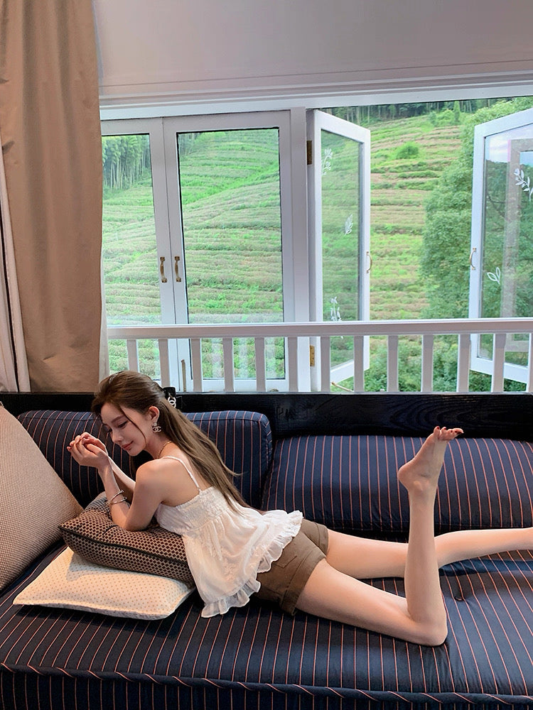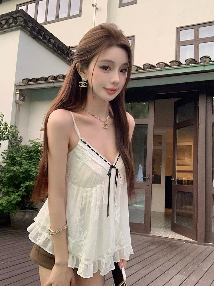 柔色时分 纯欲风织带蕾丝吊带v领上衣 Soft Hue Moment · Pure Desire Ribbon Lace V-Neck Camisole Top