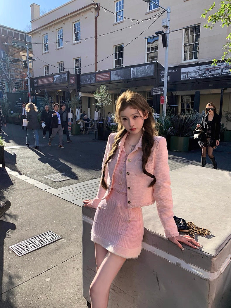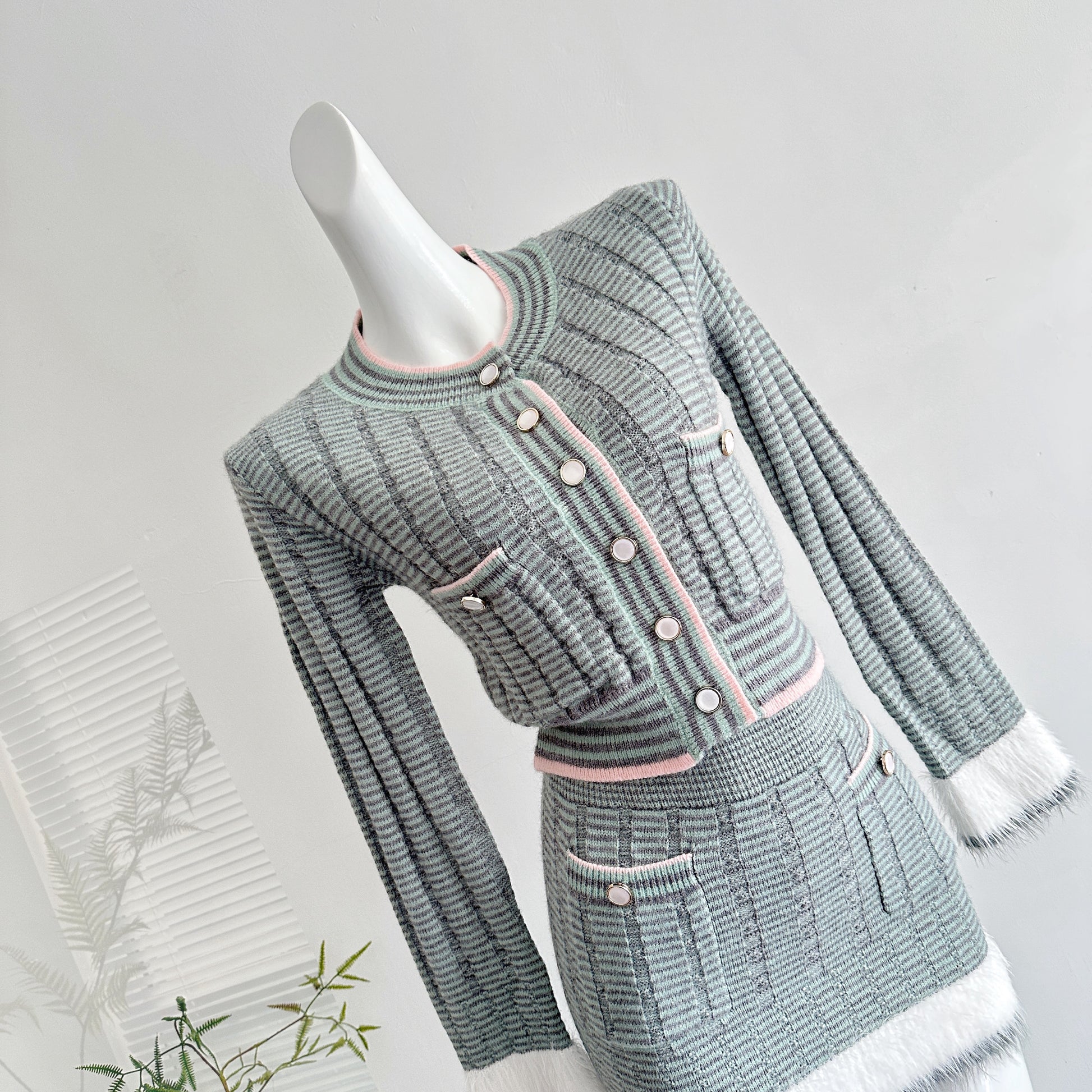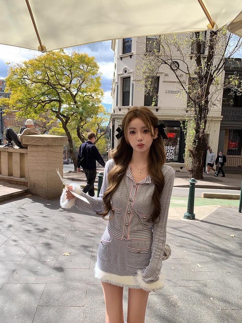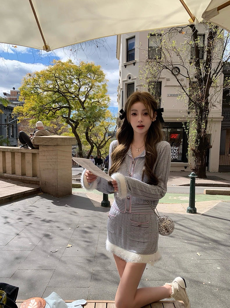 蓝花楹 宽松拼接纱线毛感针织上衣+半裙套装 Jacaranda Loose-Fit Fuzzy Knit Top and Skirt Set