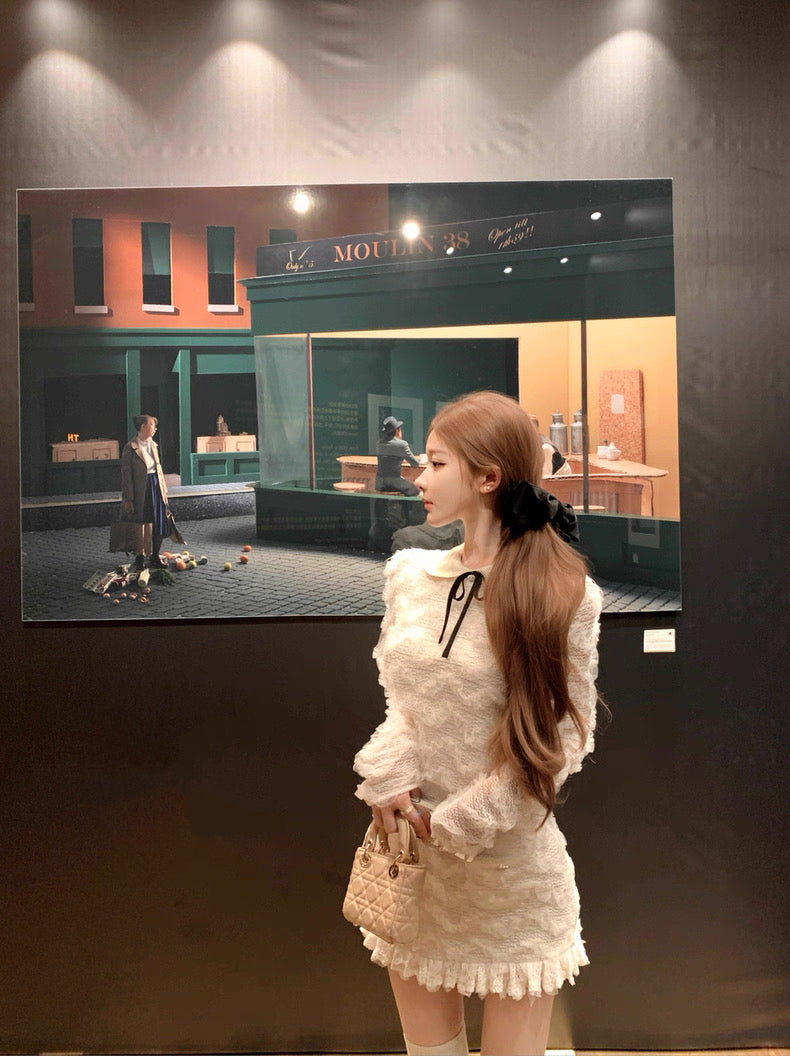 雪松星 蕾丝花边针织领上衣半裙套装 Cedar Star Lace-Trim Knit Collar Top and Midi Skirt Set