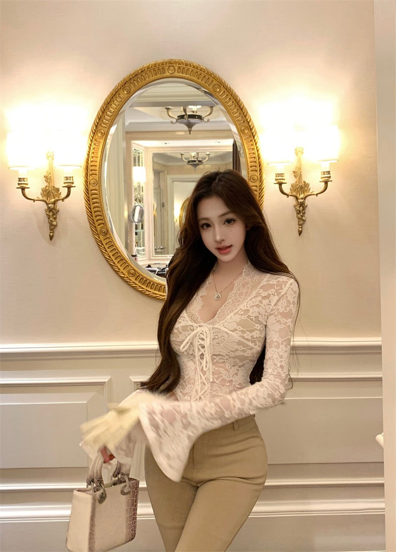 黑天鹅 V领蕾丝镂空长袖上衣 Black Swan V-neck Hollow-out Lace Long Sleeve Top
