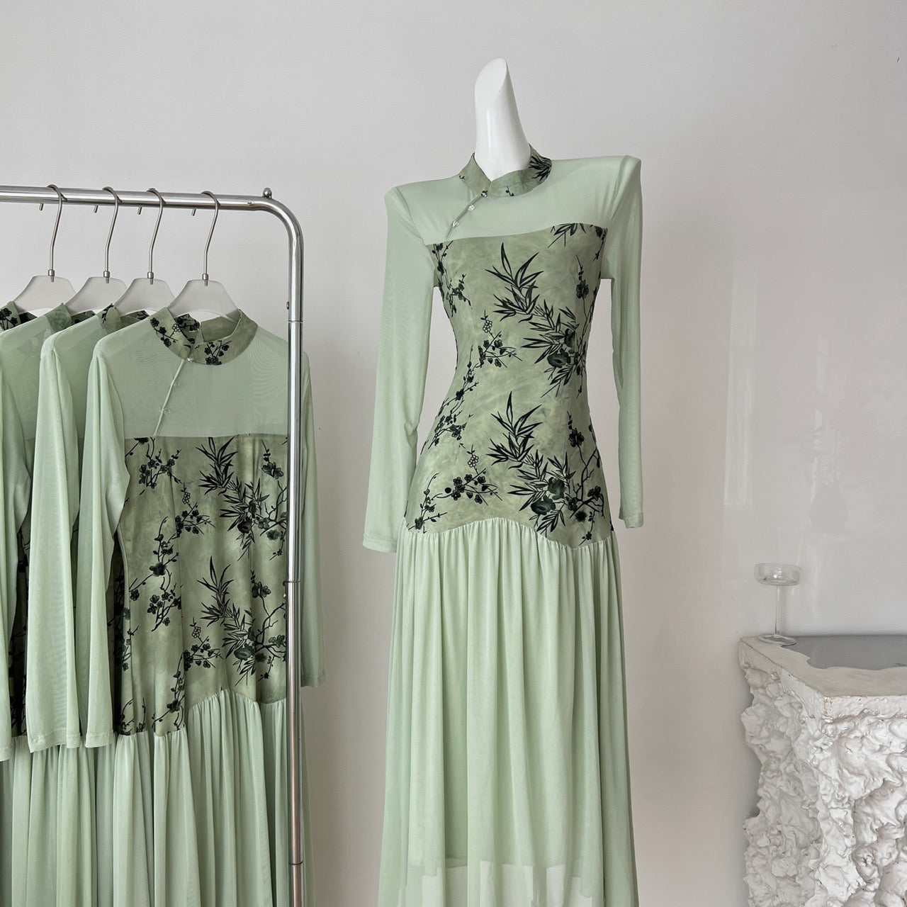 青山雾 长袖新中式温婉清雅旗袍 Qingshanwu Long-Sleeve New Chinese-Style Elegant Cheongsam